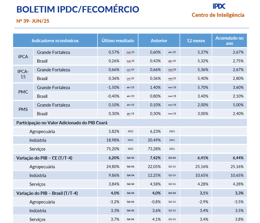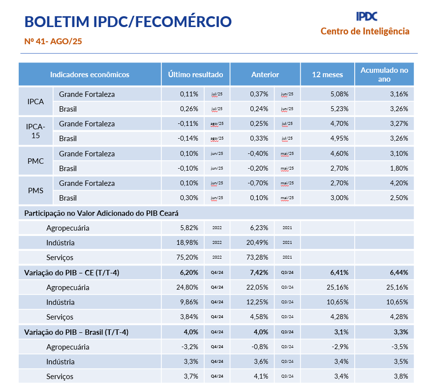 - Boletim Mensal IPDC/Fecomércio Agosto/2025No primeiro semestre de 2025, o comércio internacional do Ceará registrou US$ 1,072 bilhão em exportações e US$ 1,433 bilhão em importações, resultando em um déficit de US$ 361,3 milhões. Nos últimos três meses, o IPCA-15 do Ceará apresentou sinais de acomodação: em junho/25 houve leve alta, sustentada por Alimentação, Saúde e Habitação; em julho/25 o resultado ficou praticamente neutro, com ganhos em Alimentação compensados por quedas em Habitação e… Leia mais: Boletim Mensal IPDC/Fecomércio Agosto/2025