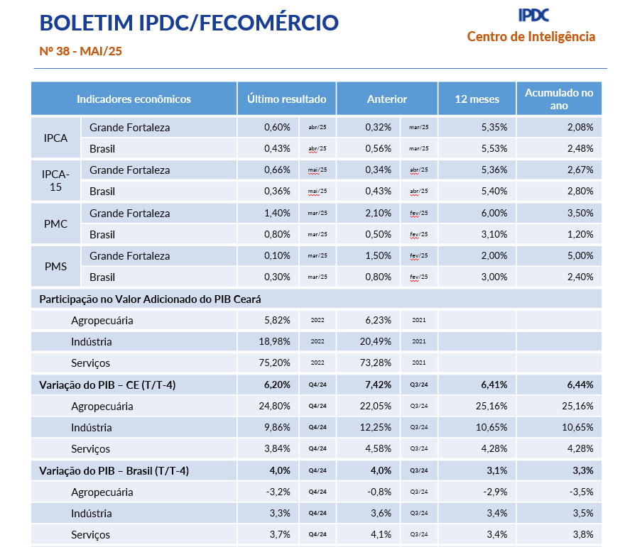 - Boletim Mensal IPDC/Fecomércio Maio/2025A População Não Economicamente Ativa (PNEA) aumentou um ponto percentual, em relação ao primeiro trimestre do ano passado, segundo dados da PNAD contínua. A proporção entre PEA e PNEA passa a ser 51% e 49%, respectivamente. O total de ocupados chegou a 3,6 milhões de pessoas, em que 52,5% estão na informalidade. A inflação de abril (0,60%) foi bem acima da projeção apontada pelo IPCA-15 (0,34%). O resultado fez o… Leia mais: Boletim Mensal IPDC/Fecomércio Maio/2025