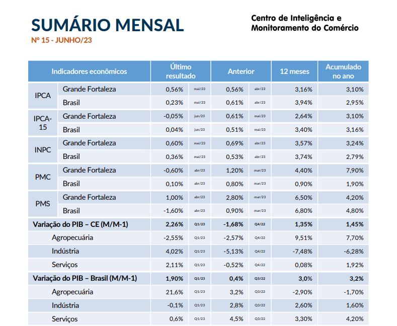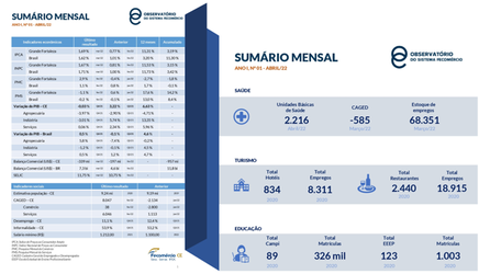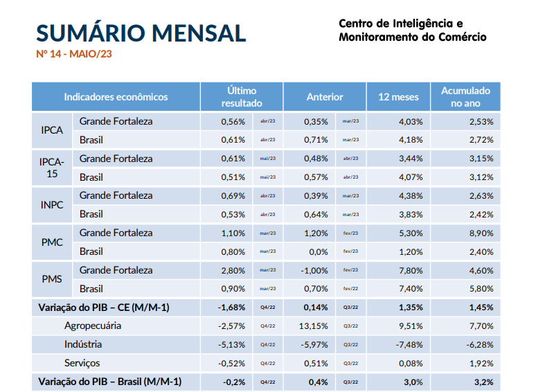 - Sumário Mensal Maio/2023O mercado de trabalho formal do Ceará mantém o saldo positivo na geração de empregos. Em abril, foram 4.488 novos empregos. No primeiro trimestre de 2023, o PIB cresceu 1,9% em relação ao trimestre anterior, na série com ajuste sazonal. Frente ao mesmo trimestre de 2022, cresceu 4,0%. N Para o mês de maio, o IPCA-15 RMF volta a superar a expectativa de inflação do país. O resultado ficou 0,1… Leia mais: Sumário Mensal Maio/2023