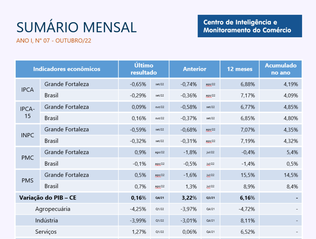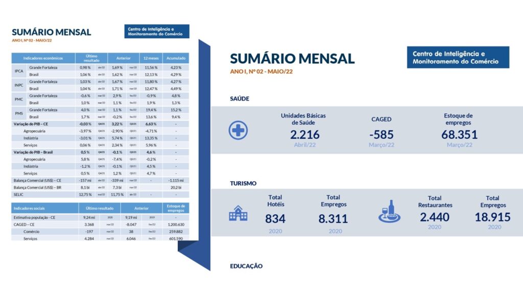 - Sumário Mensal Maio/2022Principais destaques do Mês: A inflação do mês de abril, medida pelo IPCA, apresentou redução em comparação ao mês anterior, quando atingiu 1,69% na Região Metropolitana de Fortaleza e 1,62 %, no Brasil. O CAGED de março apresentou saldo positivo de 3.368 empregos para o estado. Embora seja o melhor março desde 2020, o resultado mantém uma tendência de queda iniciada em agosto de 2021. A Taxa de juros básica… Leia mais: Sumário Mensal Maio/2022
