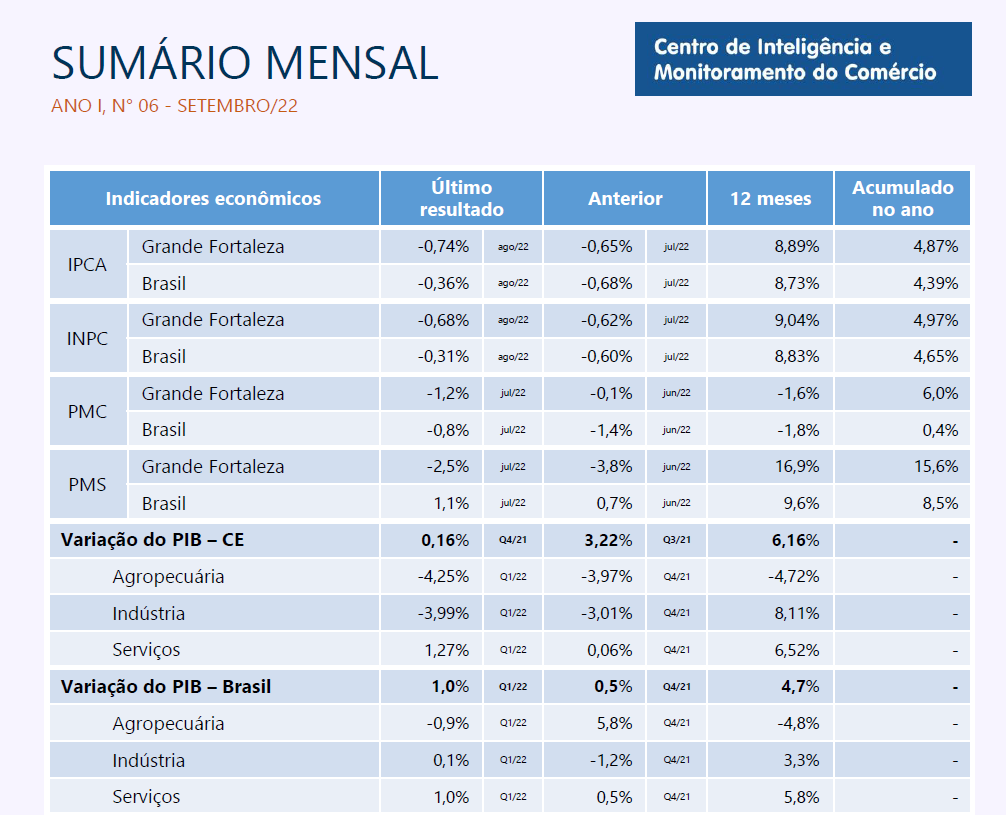 - Sumário Mensal Agosto/2023O IPCA-15, prévia da inflação oficial, avançou 0,73% em agosto na Região Metropolitana de Fortaleza (RMF) e 0,28%, no Brasil. Seis dos nove grupos de produtos e serviços pesquisados tiveram alta em agosto. O principal impacto nesse desempenho veio do grupo de Educação, com alta de 2,60%. A decisão do Comitê de Política Monetária (Copom) de reduzir a taxa Selic em 0,5% foi amplamente bem recebida por diversos setores da… Leia mais: Sumário Mensal Agosto/2023