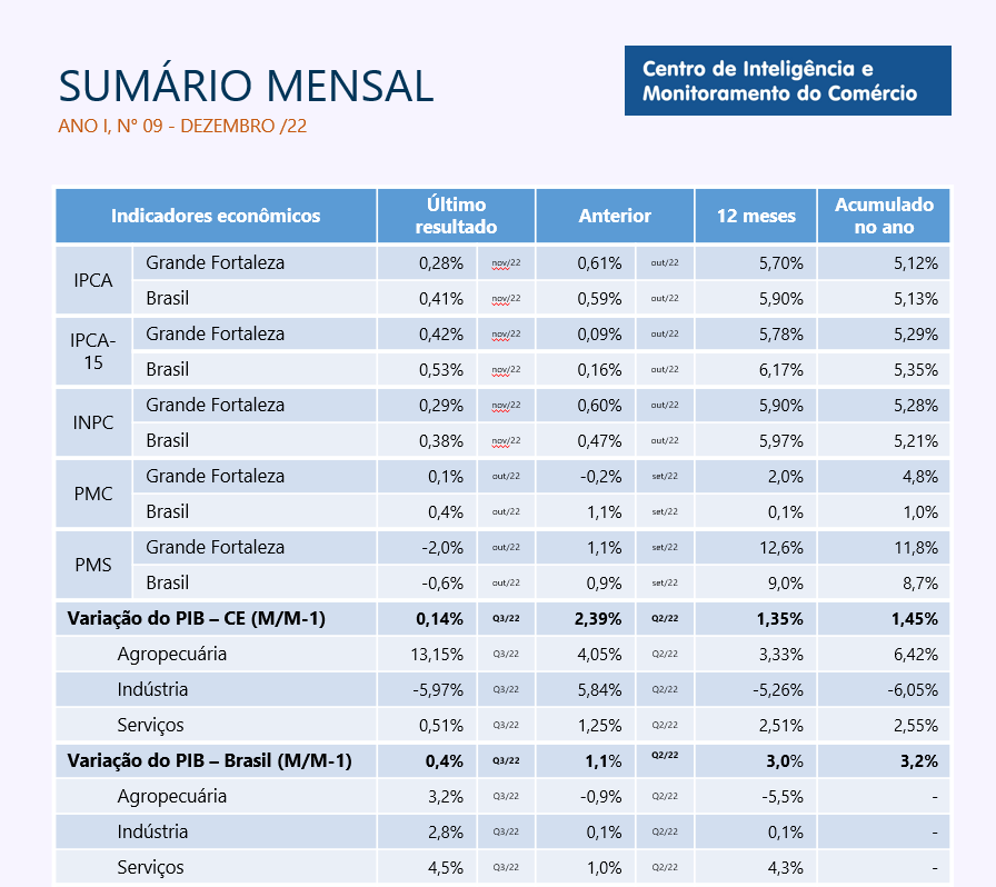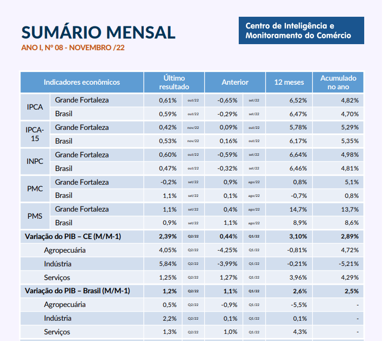 - Sumário Mensal Dezembro/2022O IPCA acumulado do Brasil, até nov/2022, é de 5,13%. O resultado já representou uma alta em relação ao mês de outubro, quando registrou 4,70%. O IPCA-15 de dezembro, sinalizou novo aumento, no valor de 0,53%. A população brasileira está fechando 2022 com níveis de endividamento e comprometimento da renda com dívidas, em patamares recordes. O CAGED de novembro apresentou saldo positivo de 6.554 novos postos de trabalho para o… Leia mais: Sumário Mensal Dezembro/2022