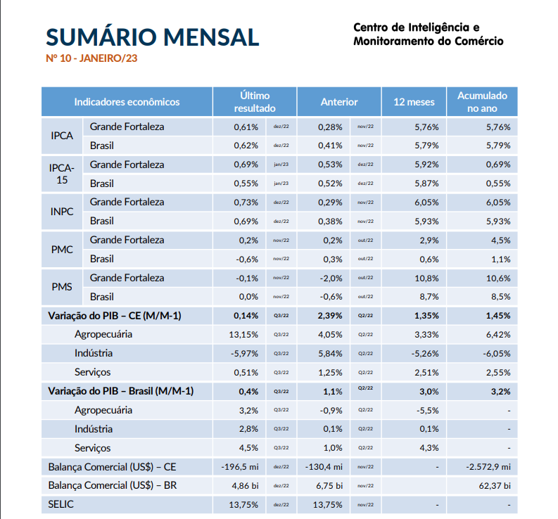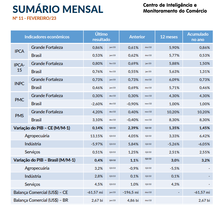 - Sumário Mensal Fevereiro/2023Os dois primeiros meses de 2023 totalizaram, segundo a Receita Federal, 15 mil empresas abertas, em todo o Ceará. Comparando com anos anteriores, o resultado retorna ao patamar de 2019, com a diferença de que naquele ano, o número de MEI era menor. A inflação acumulada pelo grupo alimentação e bebidas, no IPCA-15, completou um ano acima de 10%, no Brasil, segundo dados divulgados pelo IBGE. A Pesquisa Mensal de… Leia mais: Sumário Mensal Fevereiro/2023