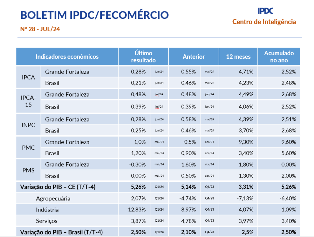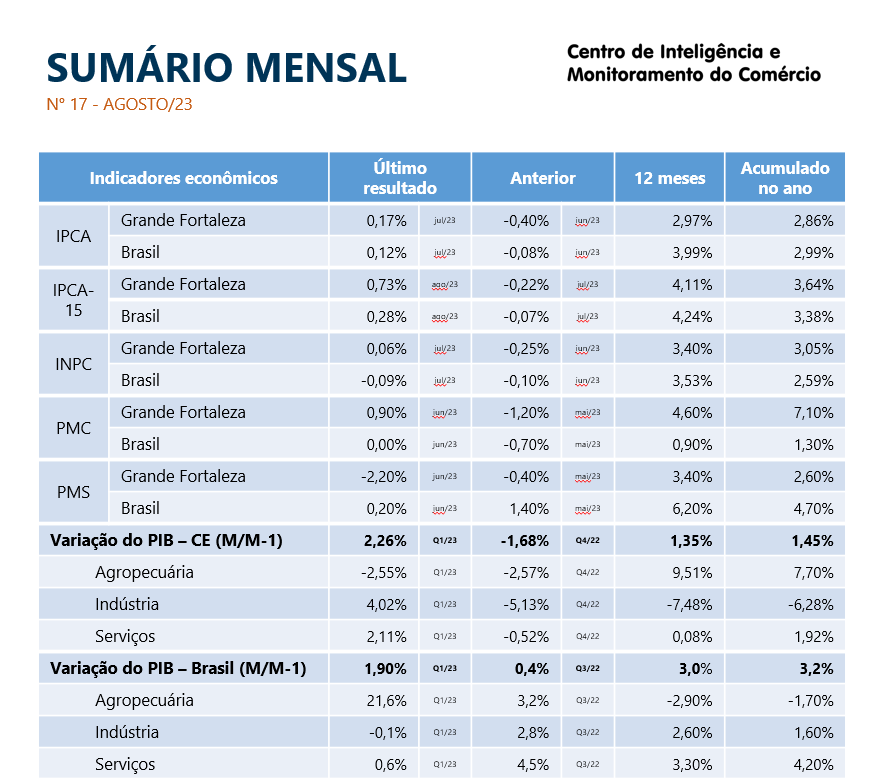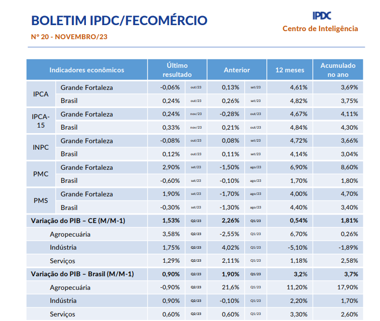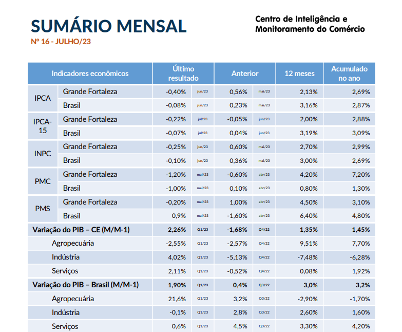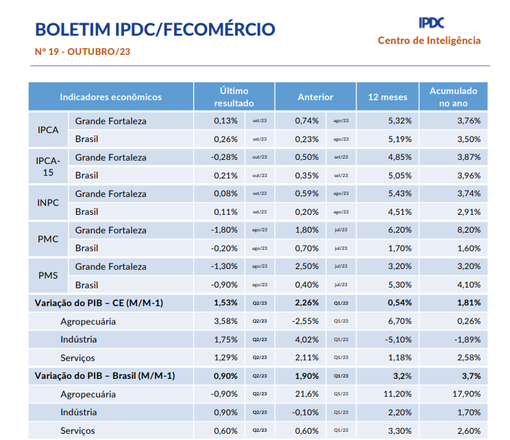 - Boletim Mensal IPDC/Fecomércio Setembro/2023Em agosto, o Índice Nacional de Preços ao Consumidor Amplo (IPCA) registrou 0,23%, abaixo da projeção de mercado de 0,28%. Nos últimos 12 meses, o índice acumulou um aumento de 4,61%, ultrapassando a meta de 3,25% estabelecida pela CMN para 2023, com uma diferença de 1,36%. O mercado de trabalho formal do Ceará mantém o saldo positivo na geração de empregos. Em julho, foram 6.490 novos empregos, -2,4% em relação… Leia mais: Boletim Mensal IPDC/Fecomércio Setembro/2023