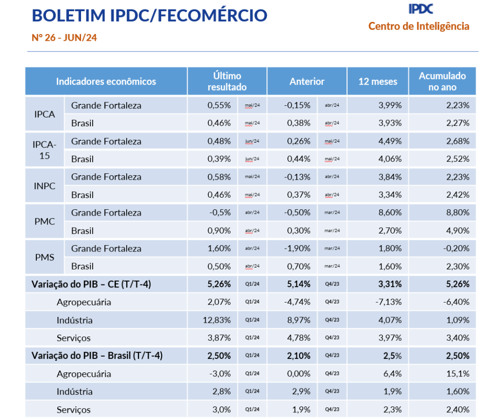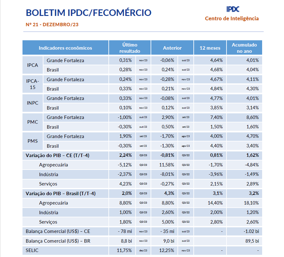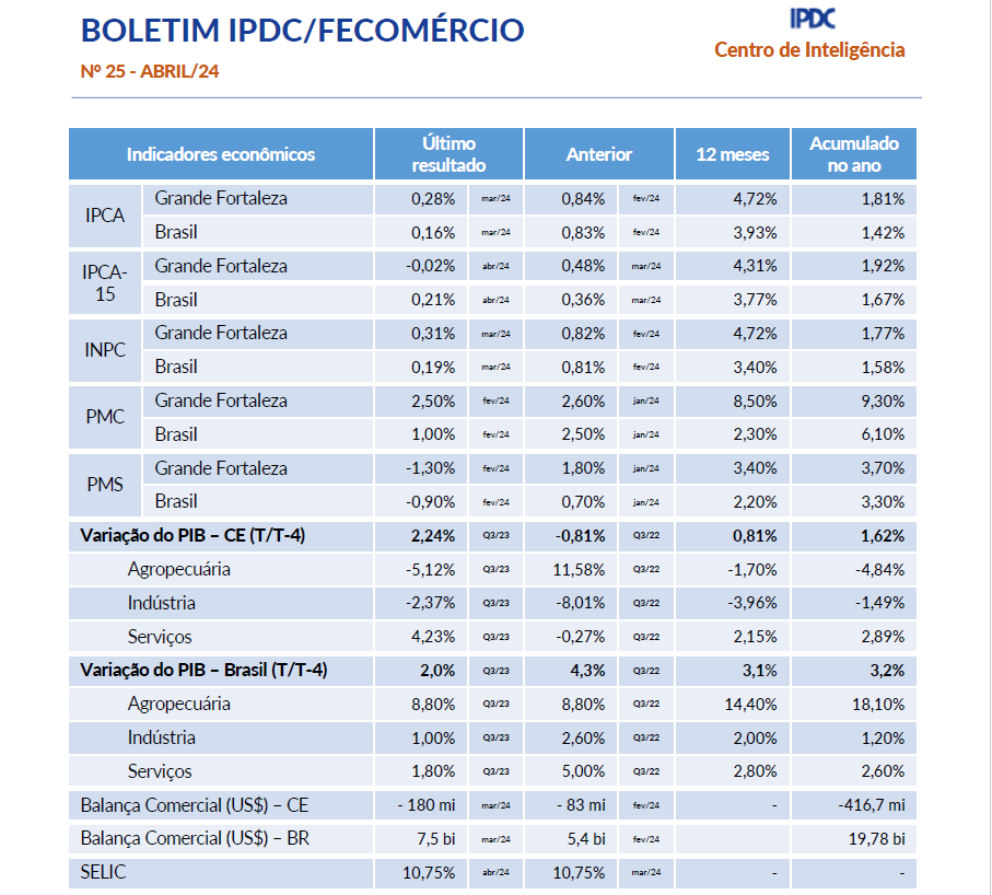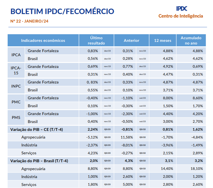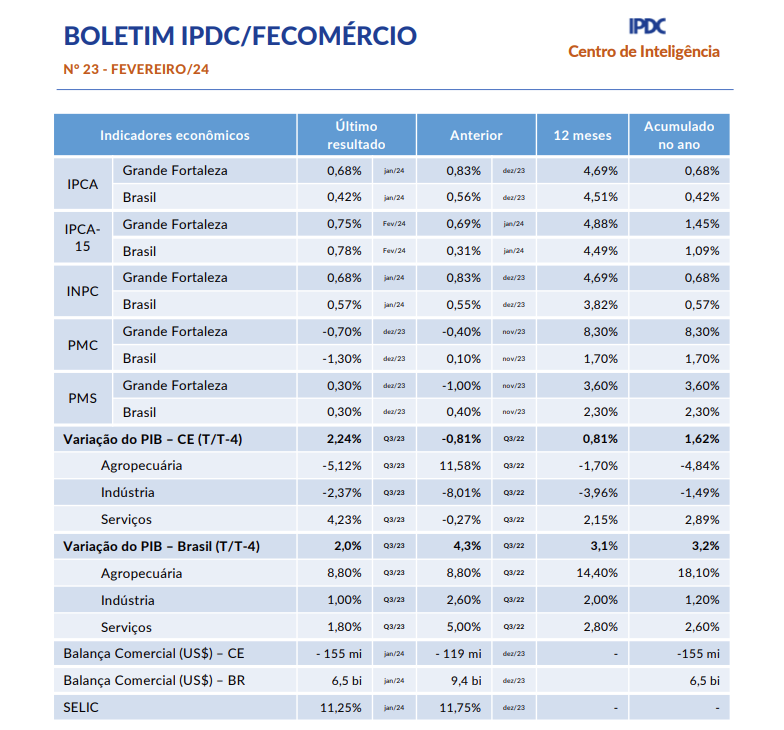 - Boletim Mensal IPDC/Fecomércio Fevereiro/2024Boletim Mensal IPDC/Fecomércio Janeiro/2024 O IPCA-15, Brasil, registrou um avanço menor do que o previsto em fevereiro. O índice aumentou 0,78%, em comparação com a previsão de crescimento de 0,83%. Como resultado, no acumulado dos últimos 12 meses, o índice atingiu 4,49%, permanecendo abaixo do limite superior da meta estabelecida pelo Banco Central O Ceará registrou a abertura de 3,8 mil novas empresas, que permanecem ativas, em janeiro de 2024… Leia mais: Boletim Mensal IPDC/Fecomércio Fevereiro/2024