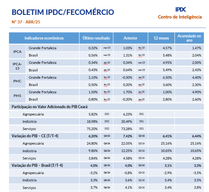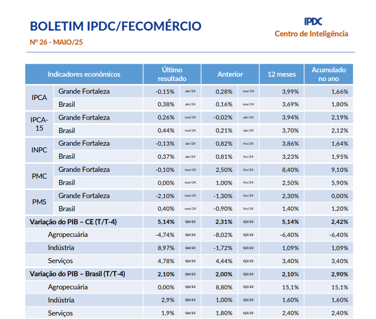 - Boletim Mensal IPDC/Fecomércio Maio/2025A População Não Economicamente Ativa (PNEA) aumentou um ponto percentual, em relação ao primeiro trimestre do ano passado, segundo dados da PNAD contínua. A proporção entre PEA e PNEA passa a ser 51% e 49%, respectivamente. O total de ocupados chegou a 3,6 milhões de pessoas, em que 52,5% estão na informalidade. A inflação de abril (0,60%) foi bem acima da projeção apontada pelo IPCA-15 (0,34%). O resultado fez o… Leia mais: Boletim Mensal IPDC/Fecomércio Maio/2025