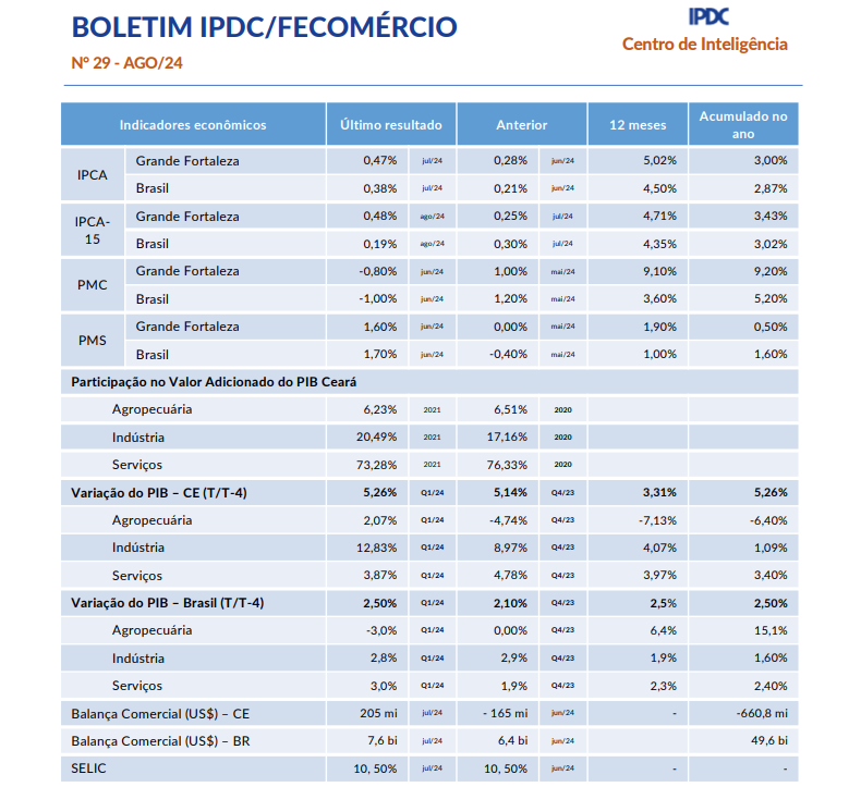 - Boletim Mensal IPDC/Fecomércio Agosto/2024O Ceará registrou a abertura de 6.939 empresas, em agosto. No entanto, a maioria desses empreendimentos eram da categoria de “Atividades de organizações políticas”, decorrente do processo eleitoral que se aproxima. Em nível Brasil, o acumulado doze meses alcançou o teto da meta, atingindo 4,50% com o resultado divulgado em julho, que veio acima do esperado (0,38%). O grupo de Transportes foi o que registrou maior variação positiva, alcançando 1,82%… Leia mais: Boletim Mensal IPDC/Fecomércio Agosto/2024