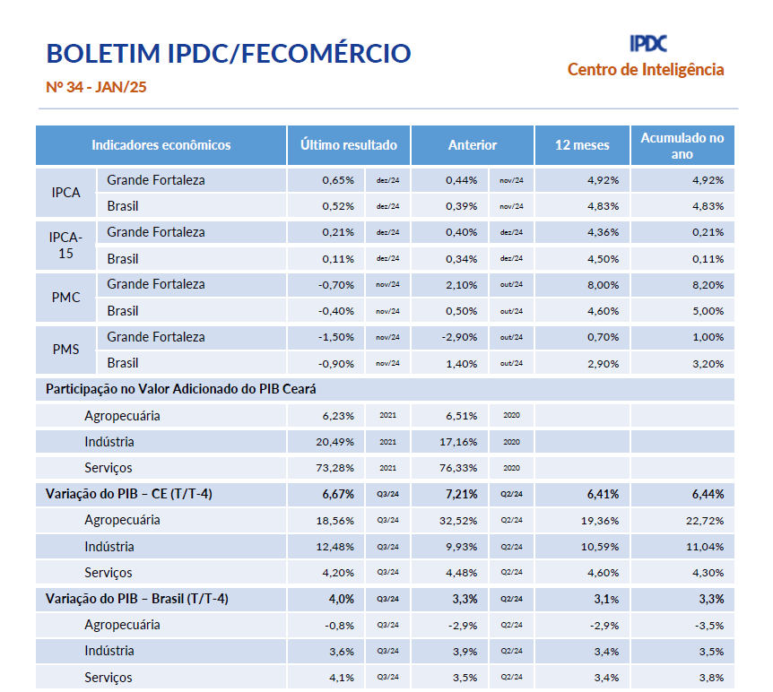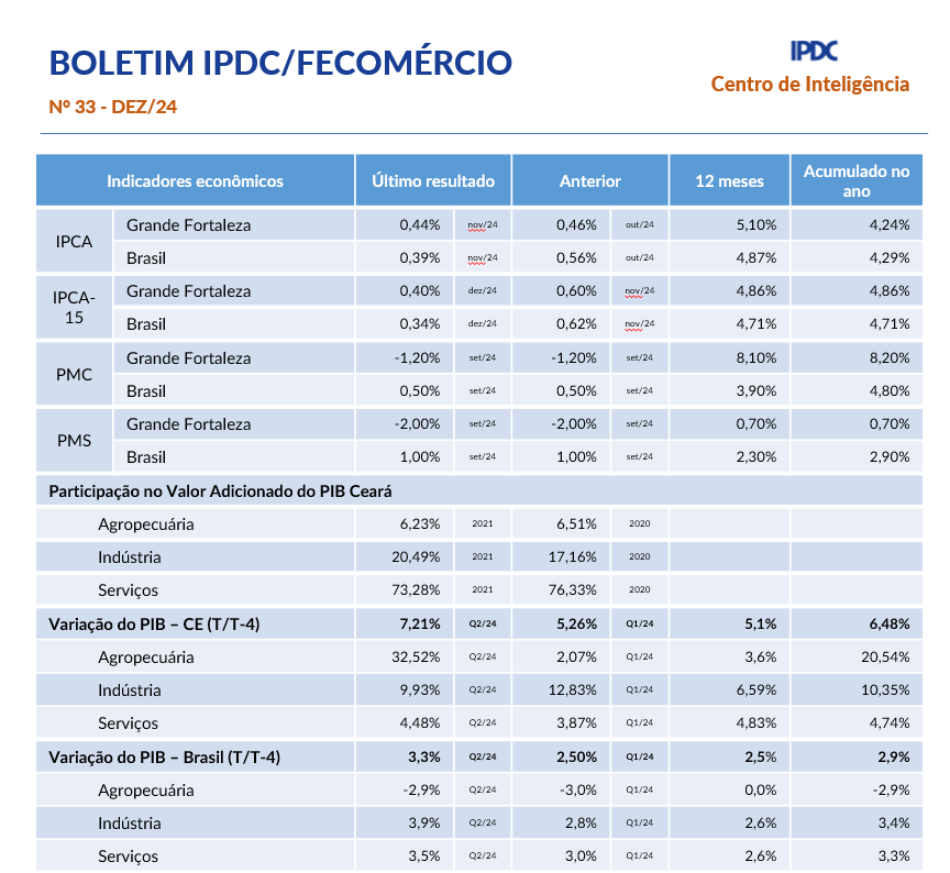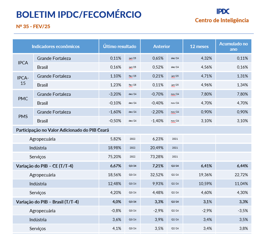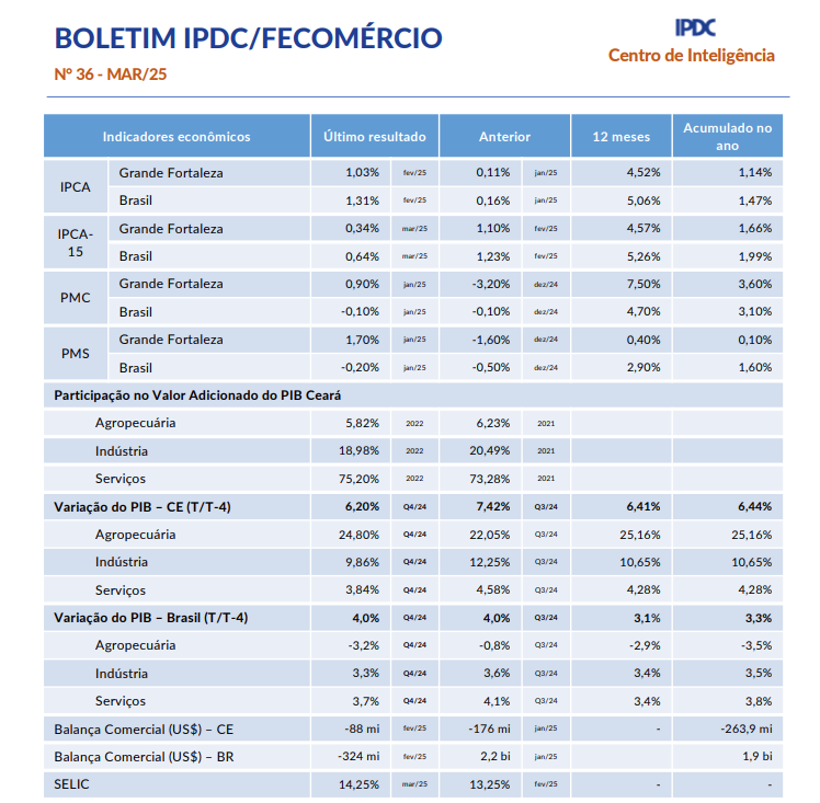 - Boletim Mensal IPDC/Fecomércio Março/2025O Produto Interno Bruto (PIB) do Ceará apresentou um crescimento de 6,49% em 2024, alcançando o melhor desempenho desde 2010 e quase o dobro da média nacional, que foi de 3,4%. Para o Ceará, a expectativa de inflação do mês de março é de 0,34%. O grupo Alimentação e bebidas é o de maior impacto na prévia composição do IPCA. A pressão é puxada pela Alimentação no domicílio, em decorrência… Leia mais: Boletim Mensal IPDC/Fecomércio Março/2025