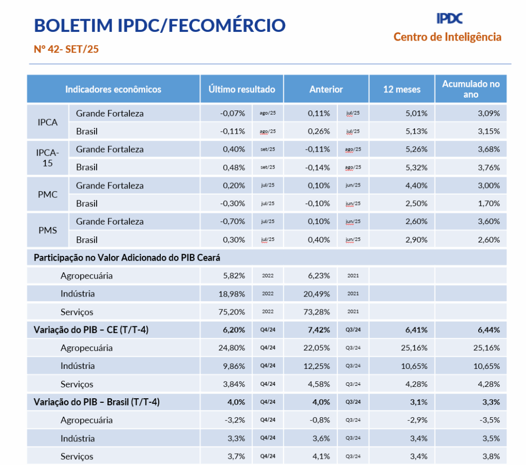 - Boletim Mensal IPDC/Fecomércio Agosto/2025No primeiro semestre de 2025, o comércio internacional do Ceará registrou US$ 1,072 bilhão em exportações e US$ 1,433 bilhão em importações, resultando em um déficit de US$ 361,3 milhões. Nos últimos três meses, o IPCA-15 do Ceará apresentou sinais de acomodação: em junho/25 houve leve alta, sustentada por Alimentação, Saúde e Habitação; em julho/25 o resultado ficou praticamente neutro, com ganhos em Alimentação compensados por quedas em Habitação e… Leia mais: Boletim Mensal IPDC/Fecomércio Agosto/2025