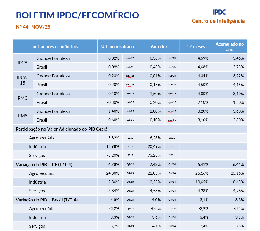 - Boletim Mensal IPDC/Fecomércio Novembro/2025A balança comercial cearense registrou superávit comercial no mês de outubro. Com as mudanças tarifárias realizada pelos EUA (redução para alguns produtos), observa-se uma melhora na tendência no comércio bilateral com o estado, que já se apresenta mais ascendente. No acumulado de 12 meses, a Região Metropolitana de Fortaleza apresenta um comportamento de preços marcado por pressões concentradas em Alimentação e Bebidas, Habitação e Saúde e Cuidados Pessoais, grupos que… Leia mais: Boletim Mensal IPDC/Fecomércio Novembro/2025
