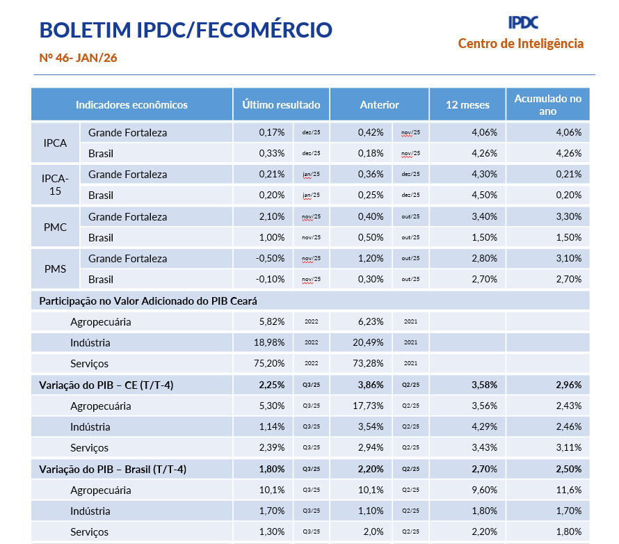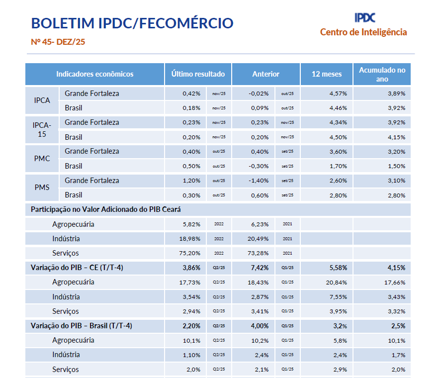- Boletim Mensal IPDC/Fecomércio Janeiro/2026O comportamento do IPCA-15 no Ceará ao longo de 2025 revela uma inflação marcada por oscilações mensais e forte heterogeneidade entre os grupos de consumo, sem uma pressão disseminada e contínua ao longo do ano. No encerramento de 2025, a inflação na Região Metropolitana de Fortaleza apresentou uma trajetória de desaceleração acentuada no grupo de Alimentação e Bebidas, que recuou de patamares próximos a 6% em julho para cerca de… Leia mais: Boletim Mensal IPDC/Fecomércio Janeiro/2026